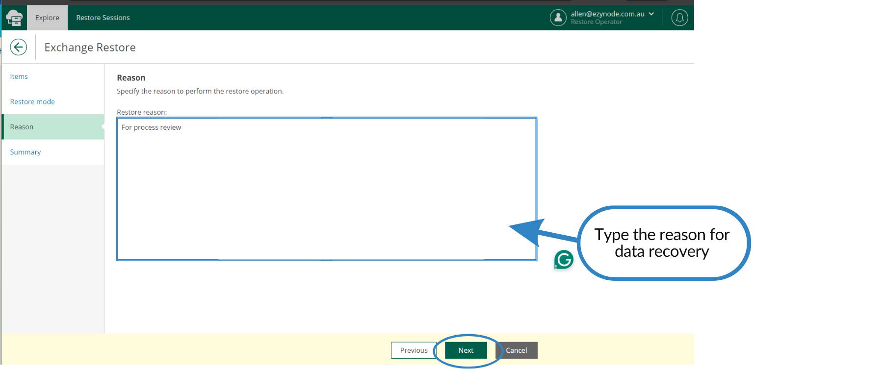 In the third tab, "Reason", type the reason to perform the restore operation. For example, "for review".